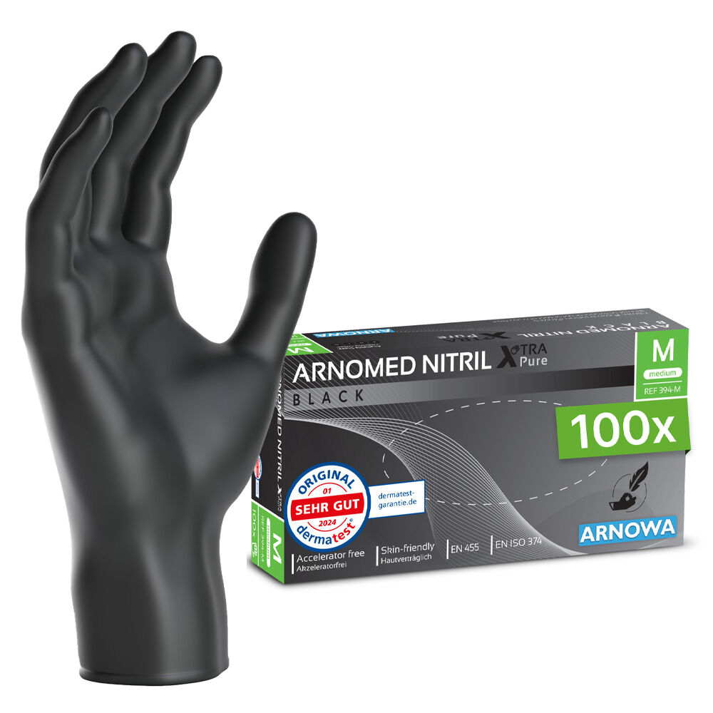 ARNOMED NITRIL XTRA PURE Einmalhandschuhe sind dank der Herstellung ohne chemische Beschleuniger, Puder und Latex besonders hautverträglich und daher ideal für Allergiker und Menschen mit sensibler Haut. Die gute Hautfreundlichkeit ist von Dermatologen mit der Note "sehr gut" bestätigt worden.